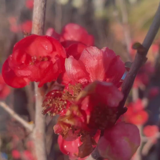 La Chaenomeles japonica, nota anche come cotogno giapponese o fior di pesco, è un arbusto a foglia caduca originario di Cina e Giappone, apprezzato per la sua spettacolare e precoce fioritura primaverile. È caratterizzata da rami spinosi, foglie verde lucido e frutti simili a piccole mele cotogne, gialli e profumati a maturità, che possono essere utilizzati per marmellate e gelatine una volta cotti. Caratteristiche principali Fioritura: Inizia presto in primavera (marzo-maggio), prima della comparsa delle foglie, con fiori che possono variare dal rosso-arancio al rosa, a seconda della varietà.Portamento: È un arbusto denso, spesso irregolare, con una crescita compatta e un'altezza che può raggiungere i 2 metri.Rami: Presenta fitti rami con spine, il che lo rende ideale per la realizzazione di siepi.Frutti: Piccoli, sferici, simili a mele cotogne, di colore giallo dorato a maturità. Sono commestibili se cotti e molto profumati, tanto da essere usati per profumare gli armadi o le stanze.Rusticità: È una pianta molto resistente al freddo e tollera anche temperature fino a \(-20^{\circ }C\).Coltivazione: Predilige posizioni soleggiate ma tollera anche la mezz'ombra. Cresce bene in qualsiasi tipo di terreno, purché ben drenato.