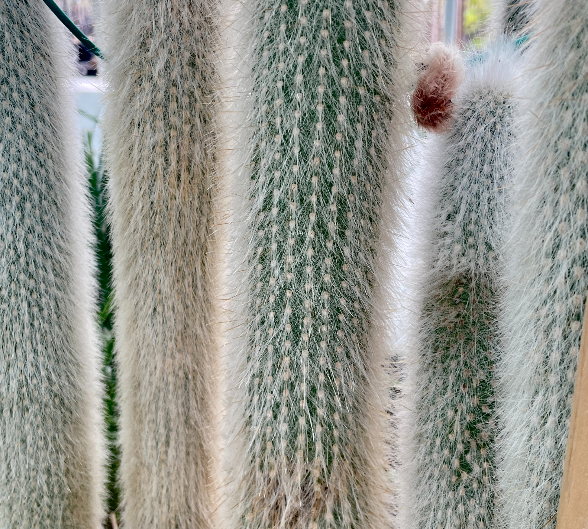 Caratteristiche fisiche Fusto: Colonnare, eretto e ramificato alla base, può raggiungere i 1-2 metri di altezza e i 6-8 cm di diametro. È di colore grigio-verde e coperto da circa 25-30 costolature.Spine: Molto numerose, sottili, bianco-argentate e setose, che conferiscono alla pianta il suo aspetto peloso e argentato. Le spine centrali sono più lunghe e di colore giallo-brunastro, anche se spesso sono nascoste dalla fitta peluria.Fiori: Nelle piante mature, in tarda estate, compaiono fiori tubolari di colore rosso-violaceo, lunghi fino a 10 cm, con un aspetto peloso e scaglioso.Frutti: Piccoli frutti globosi, rossi, lanosi e che si aprono a maturità. Coltivazione e cura Esposizione: Pieno sole.Temperatura: Tollera temperature basse, ma in climi umidi è consigliabile proteggere la base sotto i \(-5^{\circ }C\).Annaffiature: Da aprile a settembre inoltrato, senza bagnare durante l'inverno quando la pianta va in letargo.Terreno: Deve essere ben drenato per evitare ristagni idrici. Curiosità Il nome "Cleistocactus" deriva dal greco "kleistos", che significa "chiuso", riferendosi alla forma dei suoi fiori.Esiste anche la versione "crestata", con fusti appiattiti e ondulati, molto apprezzata dai collezionisti per le sue forme particolari.