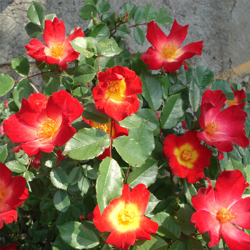 La rosa 'Cocktail' è una rosa rampicante e rifiorente con fiori semplici a 5 petali di un vivace colore rosso geranio con un centro giallo dorato che si espande man mano che il fiore matura, assumendo poi una sfumatura più rosata. Produce un profumo speziato e una fioritura continua e abbondante da maggio fino alle gelate, rendendola ideale per pergolati, muri e recinzioni.