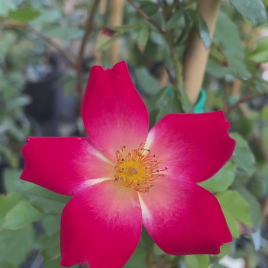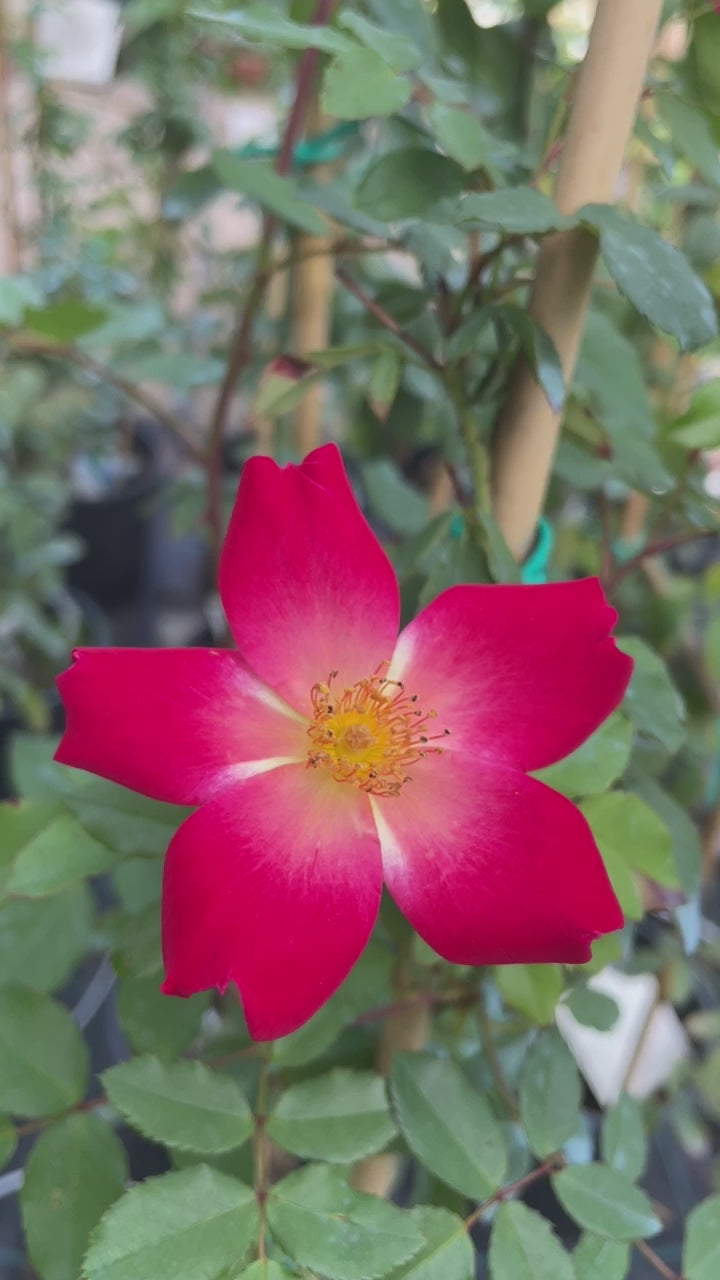 Fiori: Semplici, a 5 petali, di colore rosso geranio con centro giallo che diventa più opaco con l'età.