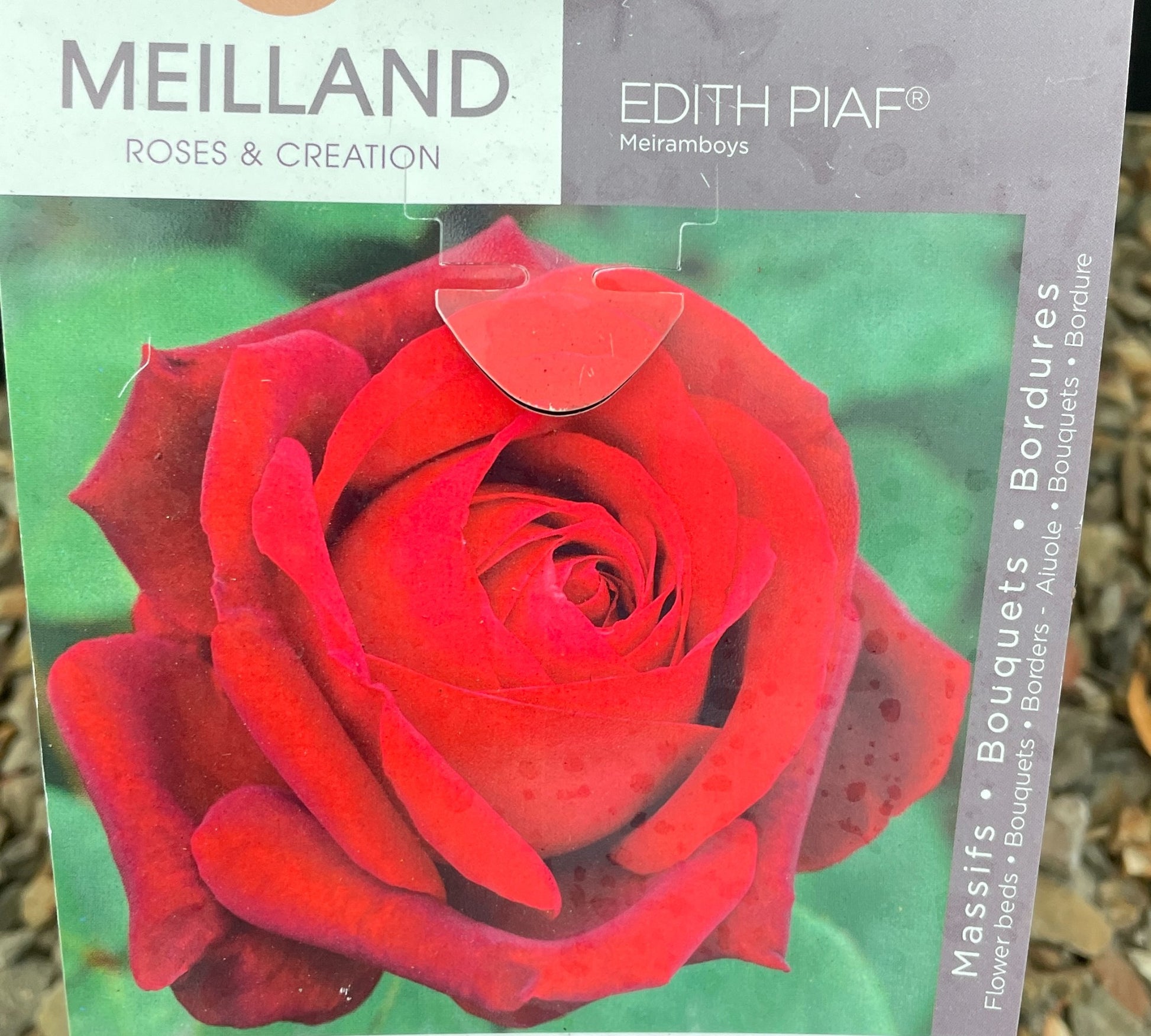 La rosa Edith Piaf è una cultivar dal colore rosso scuro vellutato e intenso, con grandi fiori a coppa composti da circa 56 petali che emanano un forte e fruttato profumo, premiato al concorso mondiale di Nantes. La pianta ha un portamento cespuglioso, fogliame verde scuro e raggiunge circa 90 cm di altezza, con una fioritura rifiorente e abbondante dalla primavera fino al primo freddo. È adatta per aiuole, bordure e vasi, e la sua forma, resistenza e profumo evocano la passione e la ricchezza della cantante francese a cui è dedicata.