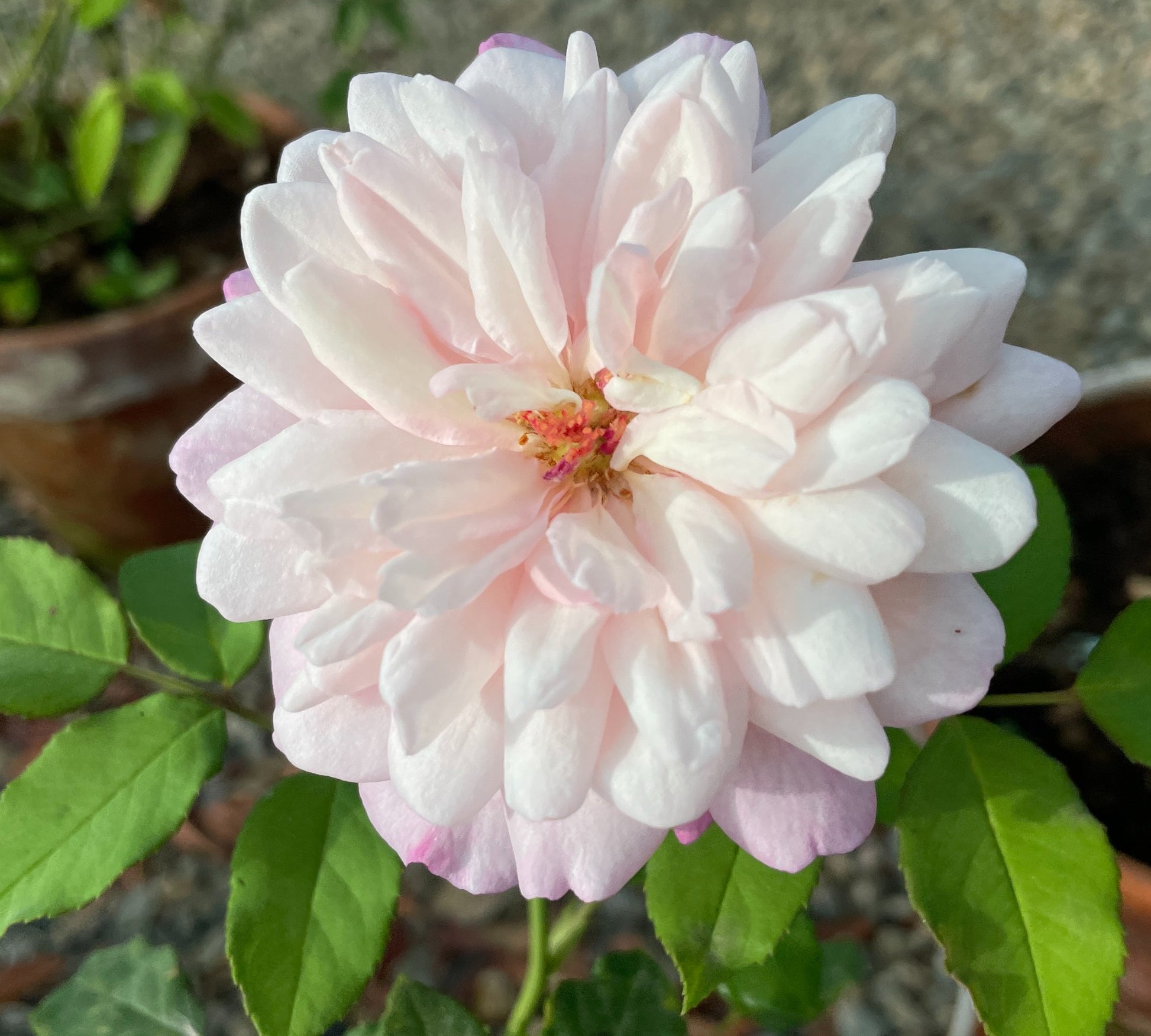 Fiori: Grandi, doppi, con circa 40-50 petali, che si aprono dal rosa salmone al bianco crema.