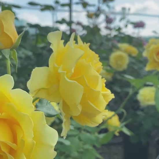 La rosa 'Happiness' Meilland è un rampicante con fiori gialli luminosi, grandi e piatti, raggruppati in grappoli da 6 a 15, e un leggero profumo. Ha una crescita rapida e vigorosa, raggiungendo facilmente i 2 metri, e produce una fioritura abbondante e rifiorente da aprile fino ai primi freddi, mostrando una buona resistenza alle malattie.