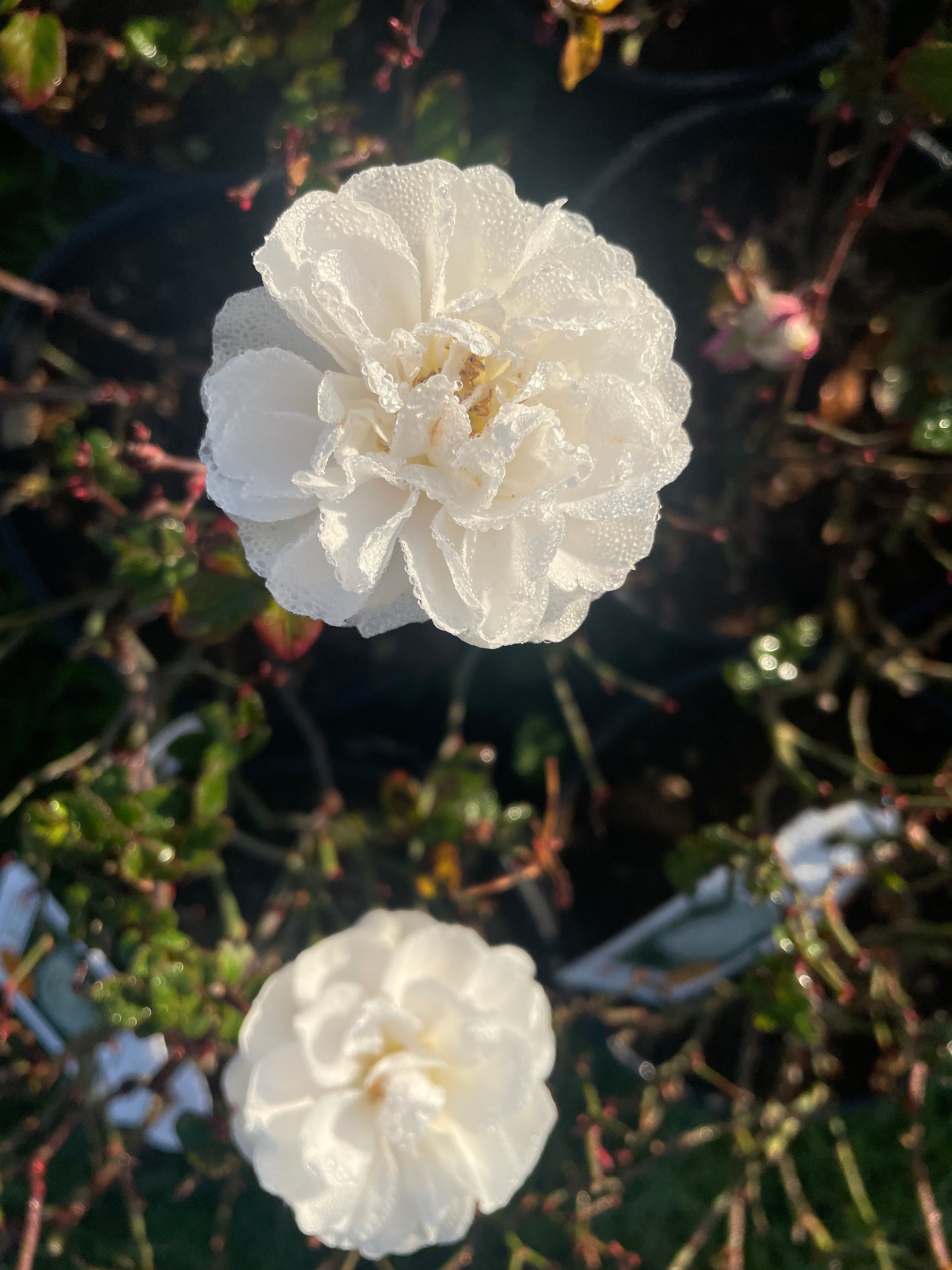 Fiori: Abbondanti, bianco puro, a coppa e semidoppi, che sbocciano in grappoli e possono diventare leggermente rosati con l'età.