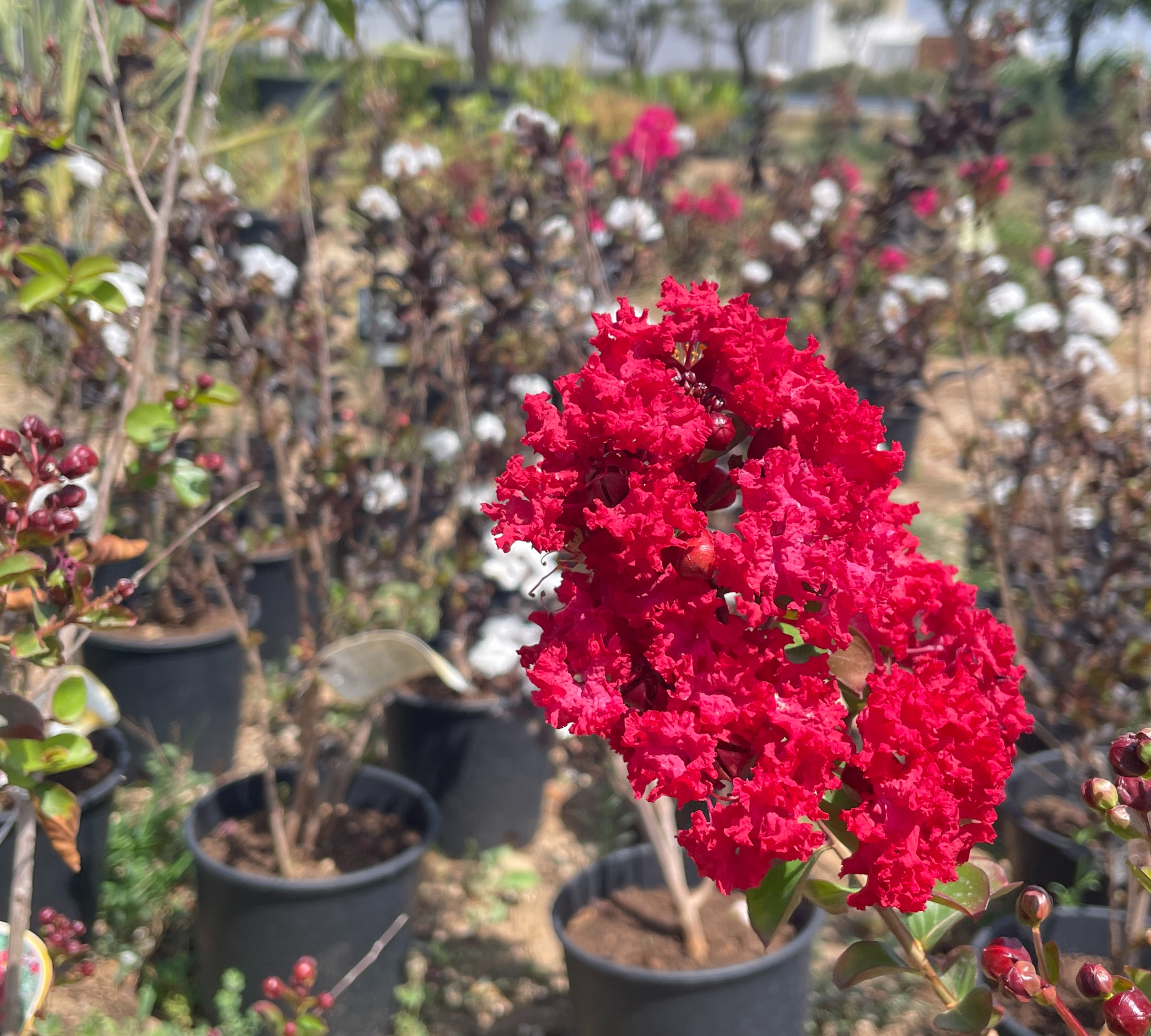 La Lagerstroemia è un arbusto ornamentale originario dell'Asia, noto per la sua abbondante fioritura estiva di colore rosa, viola, bianco o rosso e per la sua corteccia liscia e decorativa che si sfalda con l'età. Cresce fino a 3-6 metri di altezza e può assumere un portamento arbustivo o arboreo. È una pianta resistente che preferisce il pieno sole e un terreno ben drenato.