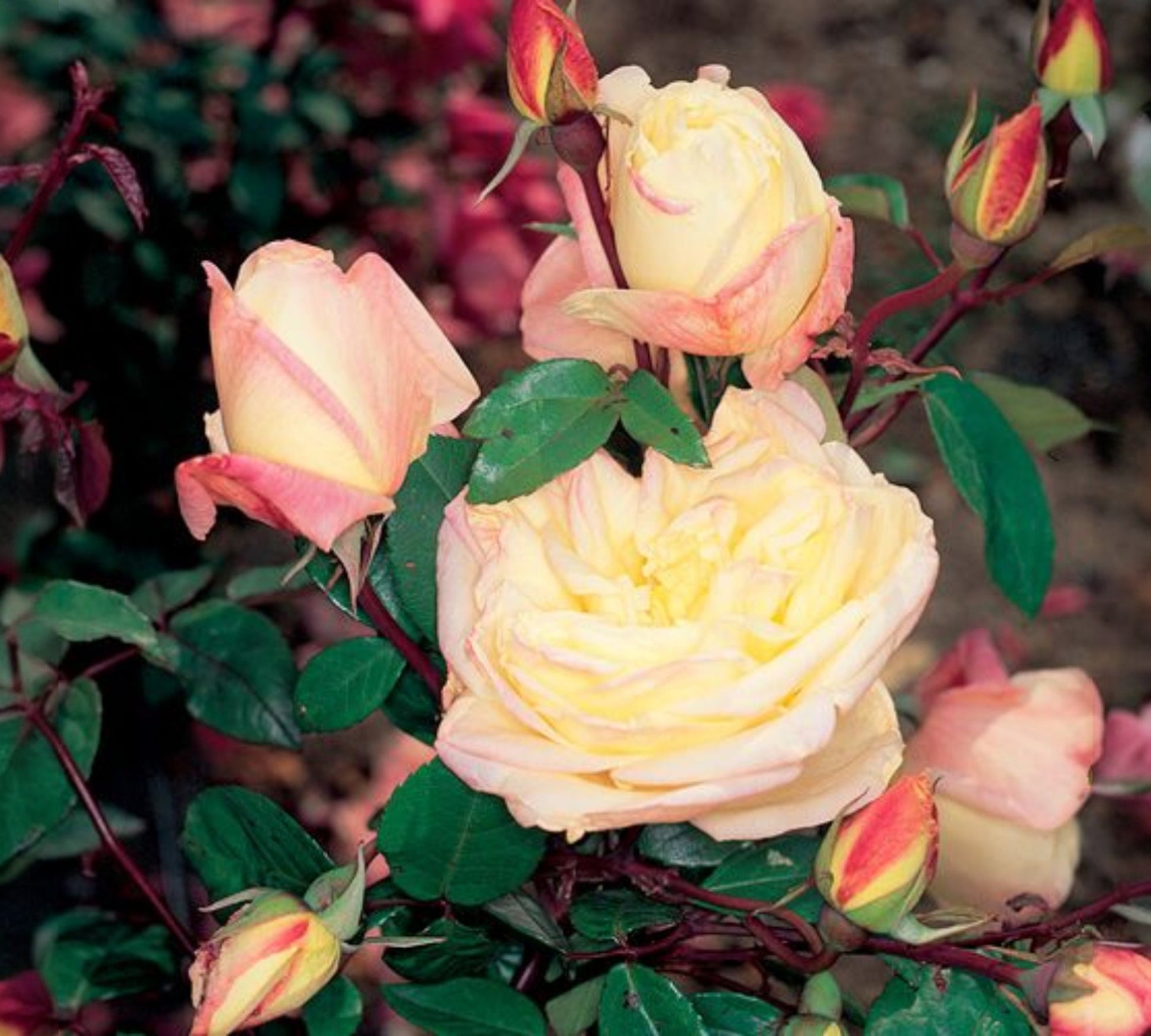 La rosa \'Marie van Houtte\' è una rosa Tea antica, introdotta nel 1871 da Ducher, nota per i suoi fiori grandi e doppi, che vanno dal giallo crema al rosa tenue con bordi più intensi. Forma un arbusto cespuglioso e vigoroso con fogliame verde lucido, fiorisce continuamente fino all'autunno, e possiede un dolce profumo fruttato, simile a quello delle rose antiche.