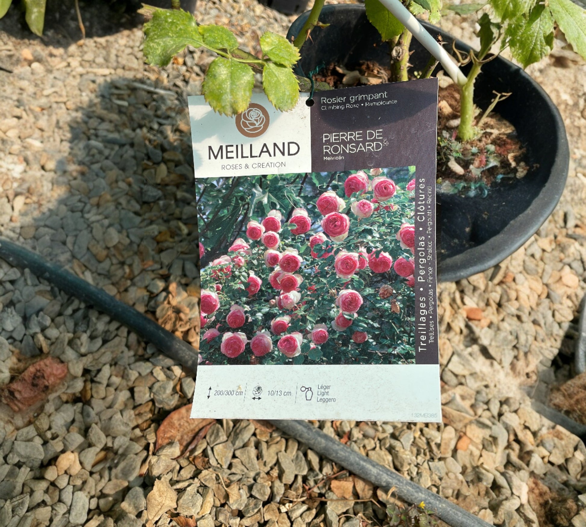 La rosa Pierre de Ronsard var. Meiviolin è una varietà di rosa rampicante rifiorente e molto vigorosa, famosa per i suoi grandi fiori romantici a coppa, ricchi di petali (oltre 70), che sfumano dal crema chiaro al rosa carminio. La pianta è resistente alle malattie e dal fogliame verde brillante, ed è ideale per decorare pareti, pergolati o archi, raggiungendo un'altezza di circa due metri e mezzo.