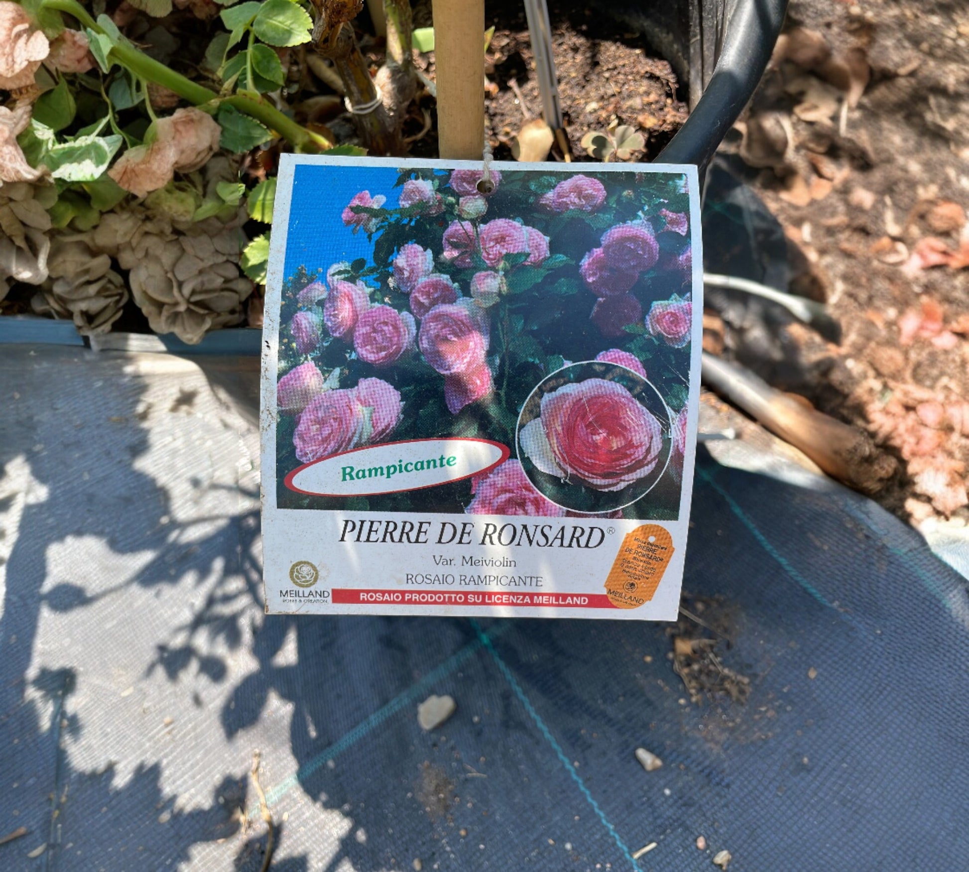 La rosa Pierre de Ronsard var. Meiviolin è una varietà di rosa rampicante rifiorente e molto vigorosa, famosa per i suoi grandi fiori romantici a coppa, ricchi di petali (oltre 70), che sfumano dal crema chiaro al rosa carminio. La pianta è resistente alle malattie e dal fogliame verde brillante, ed è ideale per decorare pareti, pergolati o archi, raggiungendo un'altezza di circa due metri e mezzo.