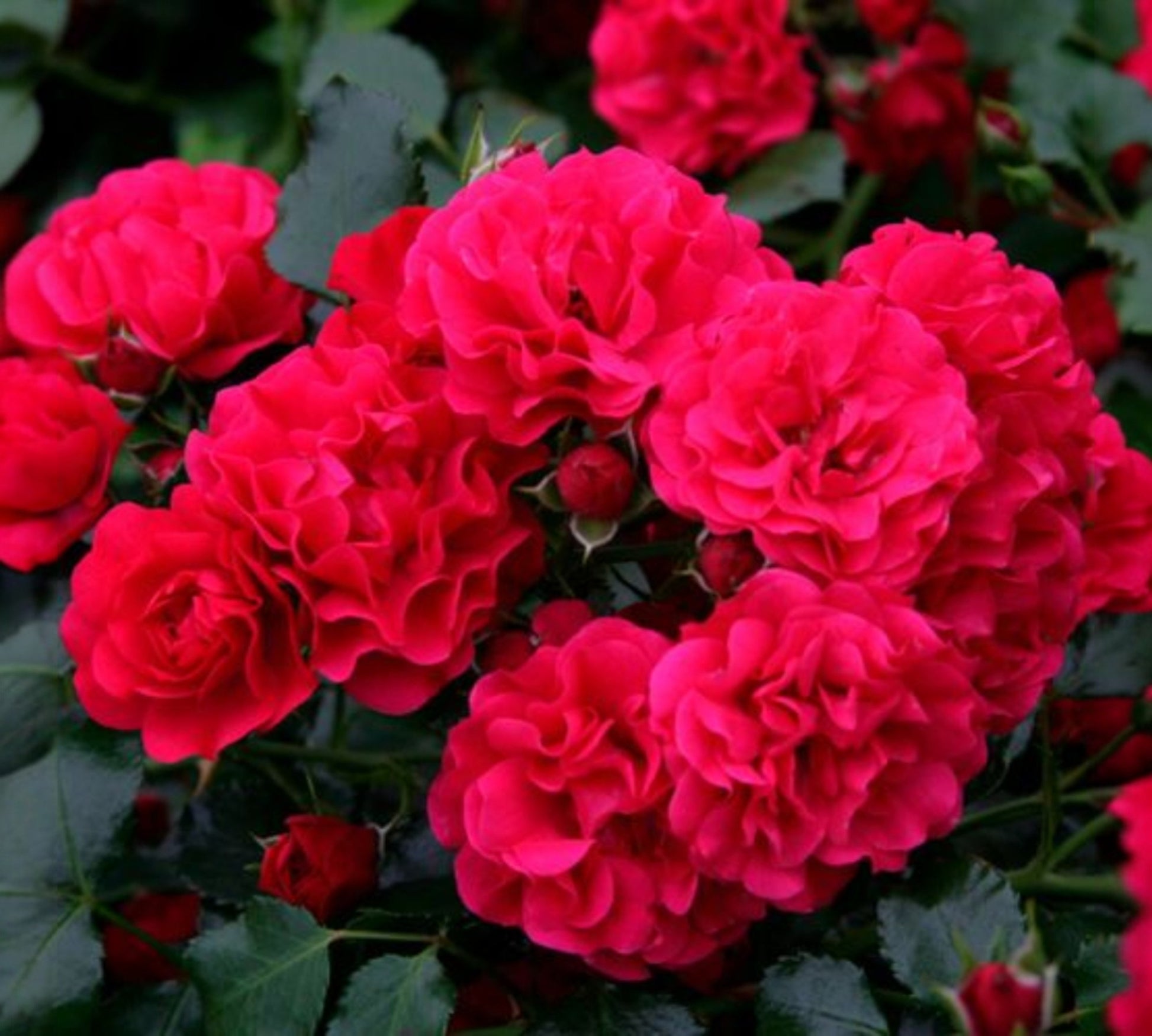 Fiori: Di colore rosso lampone intenso, con diametro di circa 3 cm, doppi e riuniti in grappoli.